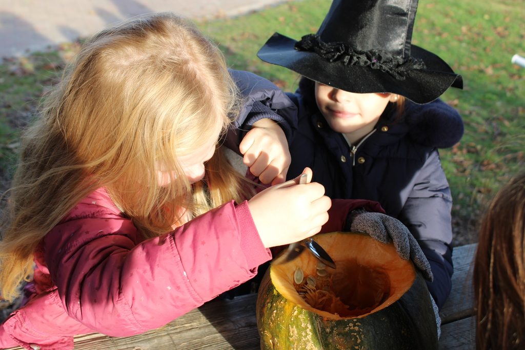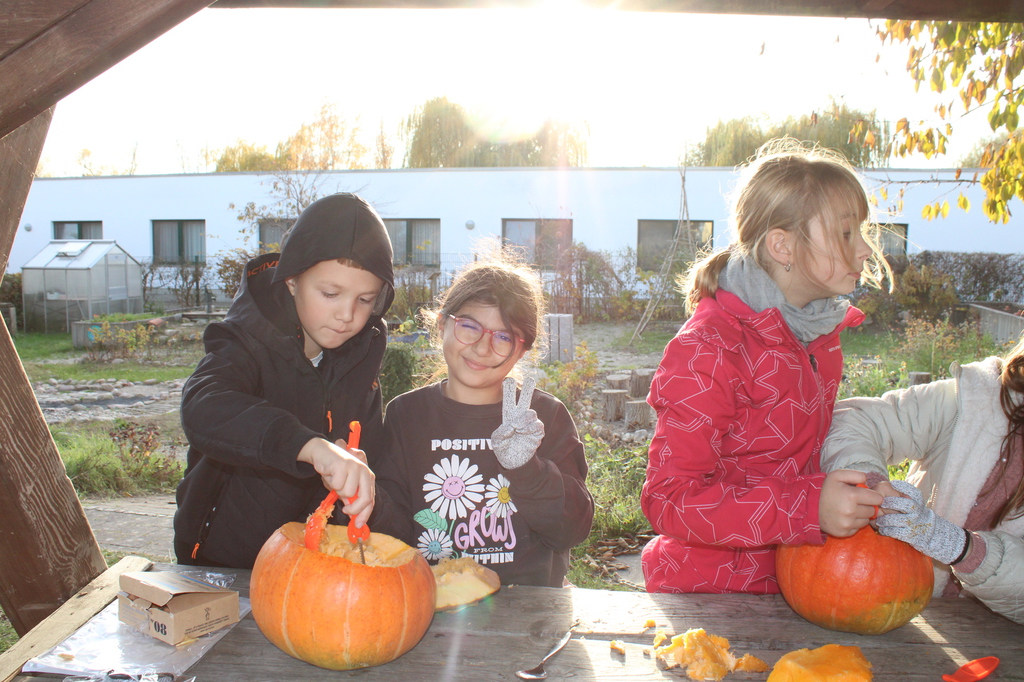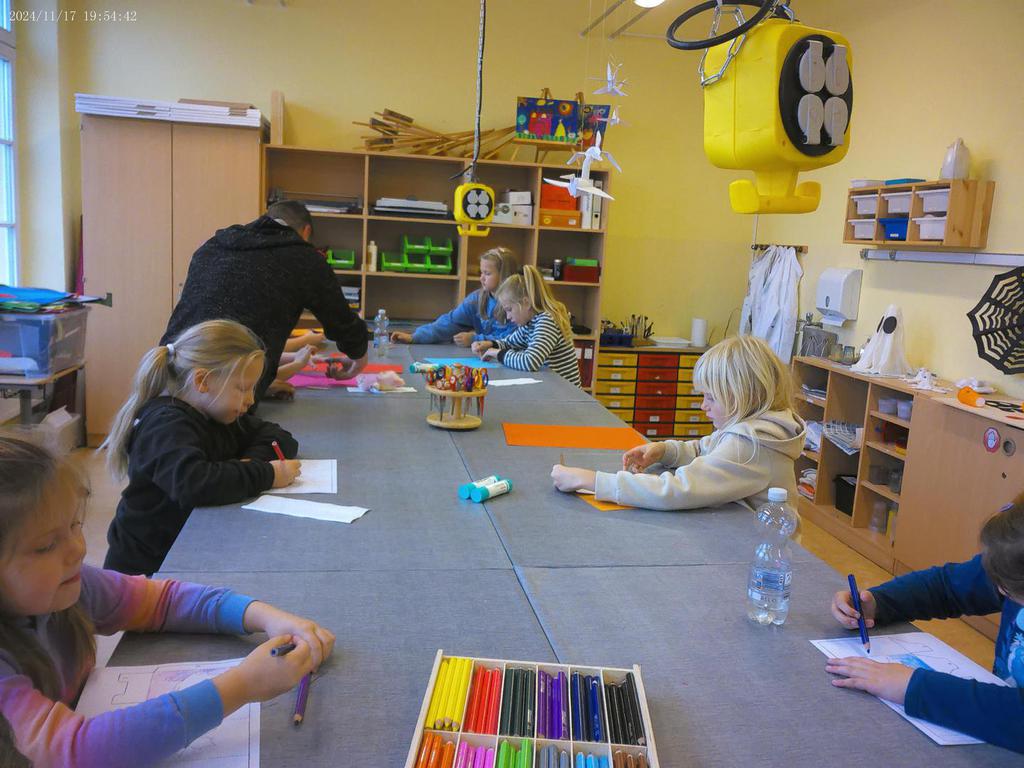 Schon beim Betreten des Hortes lag Spannung in der Luft: flackernde Kürbisse, Spinnenweben, fliegende Hexenhüte und geheimnisvolle Musik verwandelten die Räume in ein kleines Gruselschloss.