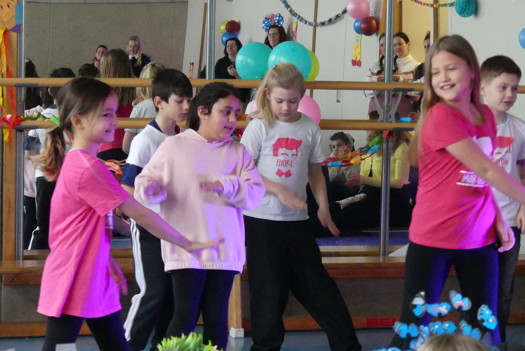 2b, das gemeinsam mit den Erziehern einstudiert wurde. Die Klasse 2b präsentierte einen schwungvollen Zumba-Tanz zum Lied „Barbie Girl“, während die Klasse 1c mit einem Tanz zum Fliegerlied „So ein