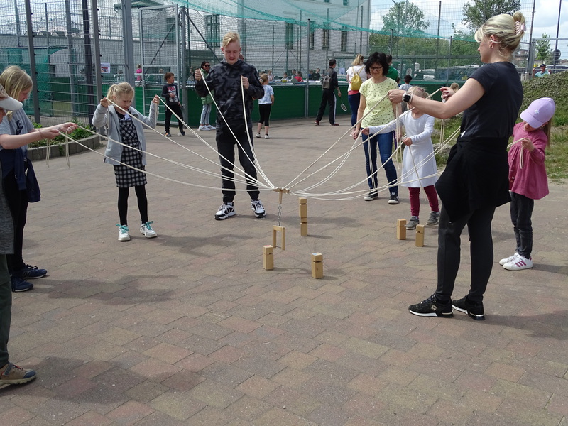 Die Feuerwehr Bützow, der TSV Bützow, die Rostocker Seawulfs und der Seniorenbeirat Bützow bereicherten das vielfältige Stationsangebot. Besonders gefreut haben wir uns über Herrn Kakka, der über den Verein „Gemeinsam leben“ ein Afghanisches Kinderspiel vorstellte. Bevorjedoch das bunte Treiben auf dem Hof des Hortes losging, wurde der Spieletag von Herrn Kloß, unserem Hortleiter eröffnet. Neben ihm standen Hortkinder der verschiedensten Nationen. Sie begrüßten die Gäste in ihren Heimatsprachen – schließlich befanden wir uns mitten in der interkulturellen Woche.