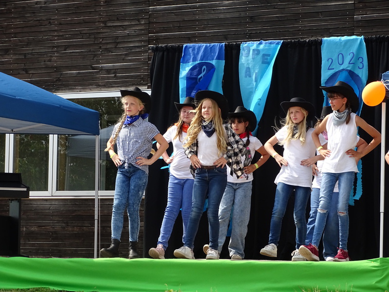Auch Ahmads Fahne aus Afghanistan war dort zusehen. Gemeinsam mit Selina und Zoe' führte er zunächst durch ein buntes Programm der Hortkinder. Von einem heißen Klavierstück, gespielt von Hugo Schröder, über einen mitreißenden Becherrap der 3a, bis hin zu coolen Tanzeinlagen der Viertklässler, war alles dabei. Höhepunkt war für Viele der Auftritt unserer ukrainischen Hortkinder. Lange haben sie mit Mariias Oma einen traditionellen Tanz einstudiert - extra für diesen Tag. In schönen Trachten kamen sie auf die Bühne und überreichten in ukrainischer Manier Brot und Salz an den Gastgeber, bevor sie alle Zuschauer mit ihrem Tanz mitrissen. Doch auch die Kleinen vom Rühner Jugend- und Kulturverein begeisterten als Barbie-Girls mit ihrem Auftritt. Nach dem Programm lud das Moderatorenteam noch alle Gäste an die Festivalstände ein. Es konnten Handabdrücke auf unserer zukünftigen Schlossplatzfahne hinterlassen oder Festival-Buttons gestanzt werden.