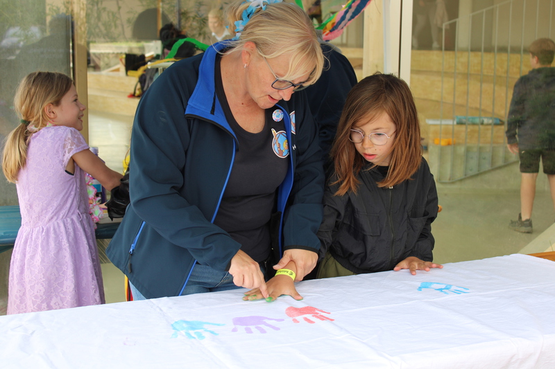 Bei Frau Schorning vom Freizeittreff konnte man coole Rhythmen trommeln und bei den Horterzieherinnen mit dem Schwungtuch spielen. Besonders gefreut haben wir uns über die Stände von unseren ukrainischen Eltern, die Kuchen und Gebasteltes verkauften oder vom Verein "Gemeinsam leben", an dem man arabische Spezialitäten kosten und ins Gespräch kommen konnte. Bunt und vielfältig war auch der Stand unseres Trägers, der Stadt. Dort gab es z.B. Riesenluftballons und eine "bützondere" Kreidemalaktion. Trotz des etwas kühleren, aber zum Glück trockenen Wetters, war der Andrang am Eispavillon-Stand und bei unserem Getränkeverkauf sehr groß.